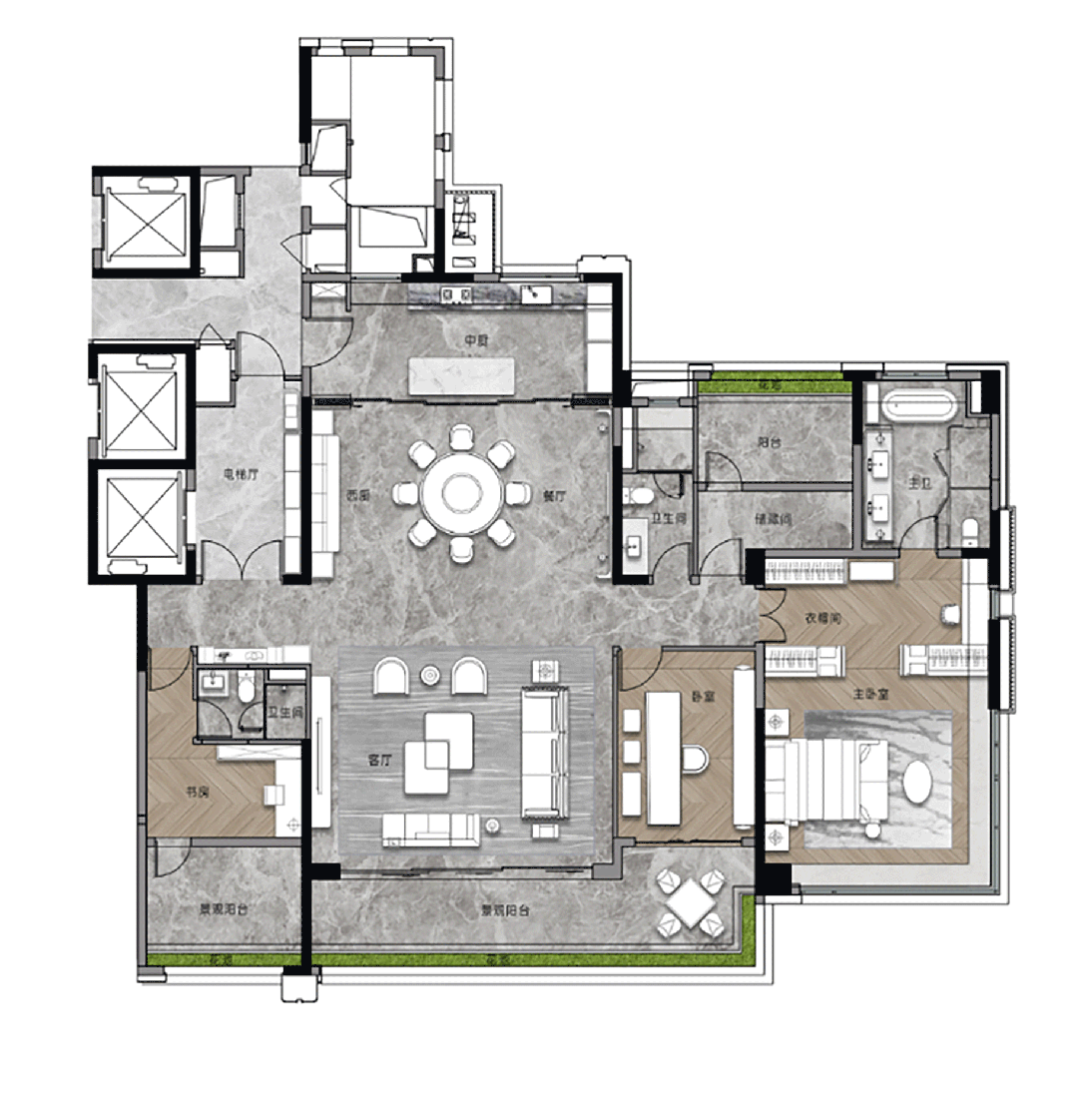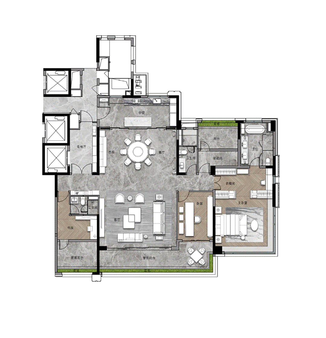 3T2户设想,有保姆电梯,保姆房:业从独梯入户,和保姆分隔,如斯低的梯户比,意味着舒服便利,同时了私密性。